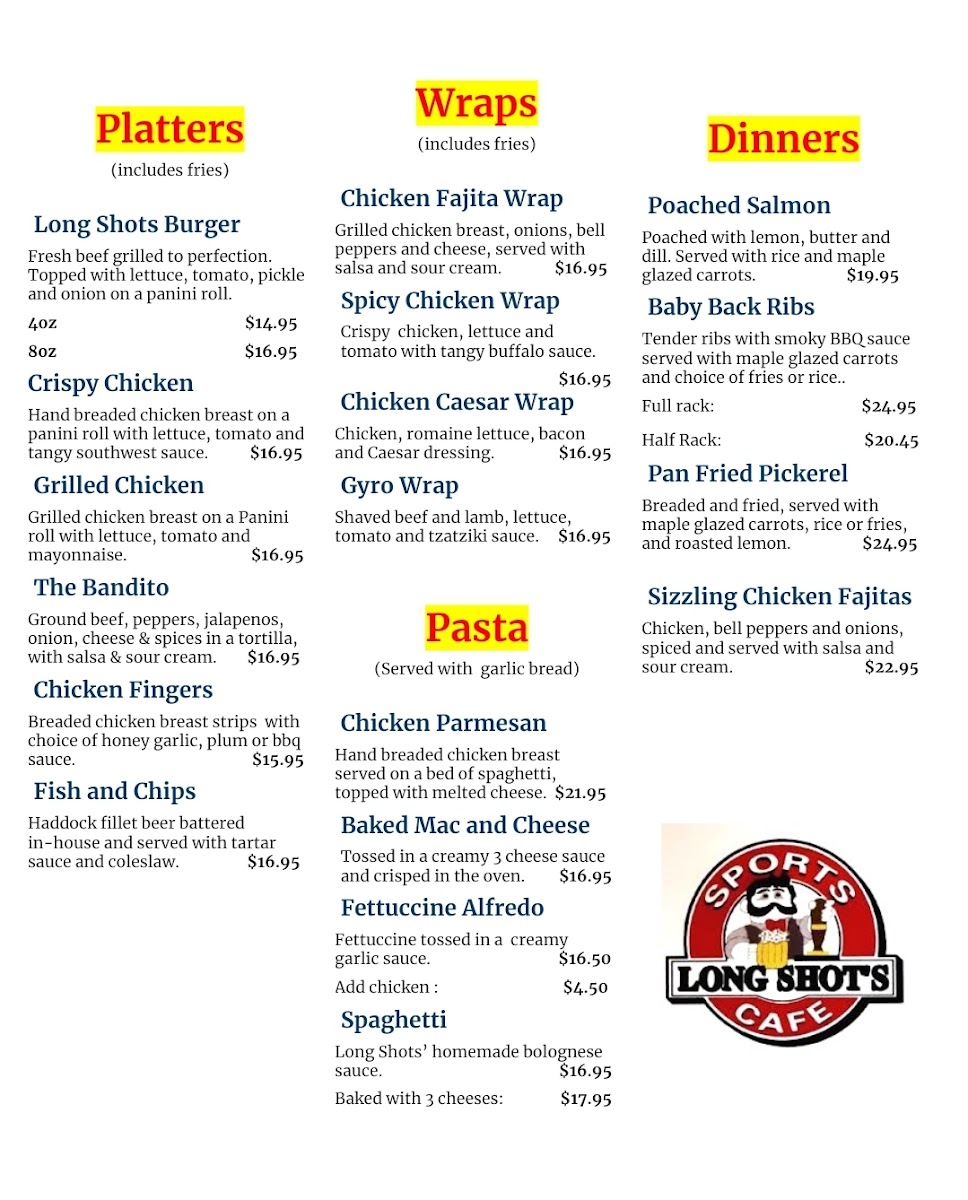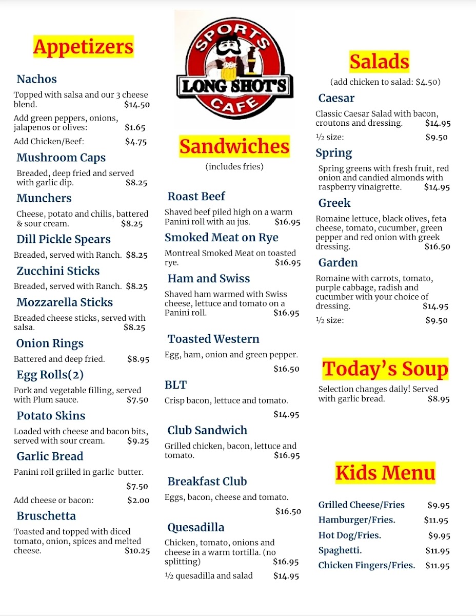 Welcome to Long Shot's Sports Cafe, your ultimate destination for satisfying comfort food in Deep River, Ontario. Situated at 1 Champlain St, this cozy eatery boasts a diverse menu designed to please everyone. Whether you're in the mood for succulent Roast Beef or a classic Club Sandwich, each dish is crafted with quality ingredients and generous portions.
